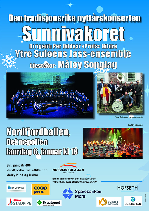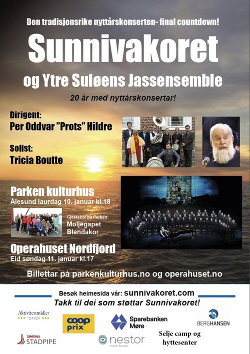 Dette året vert nyttårskonsertane 5. januar i Brattvåg på Ingebrigt Davik-huset, og 6. januar i Ulsteinvik på Sjøborg kulturhus. Vi håpar mange vil få med seg denne feiringa!